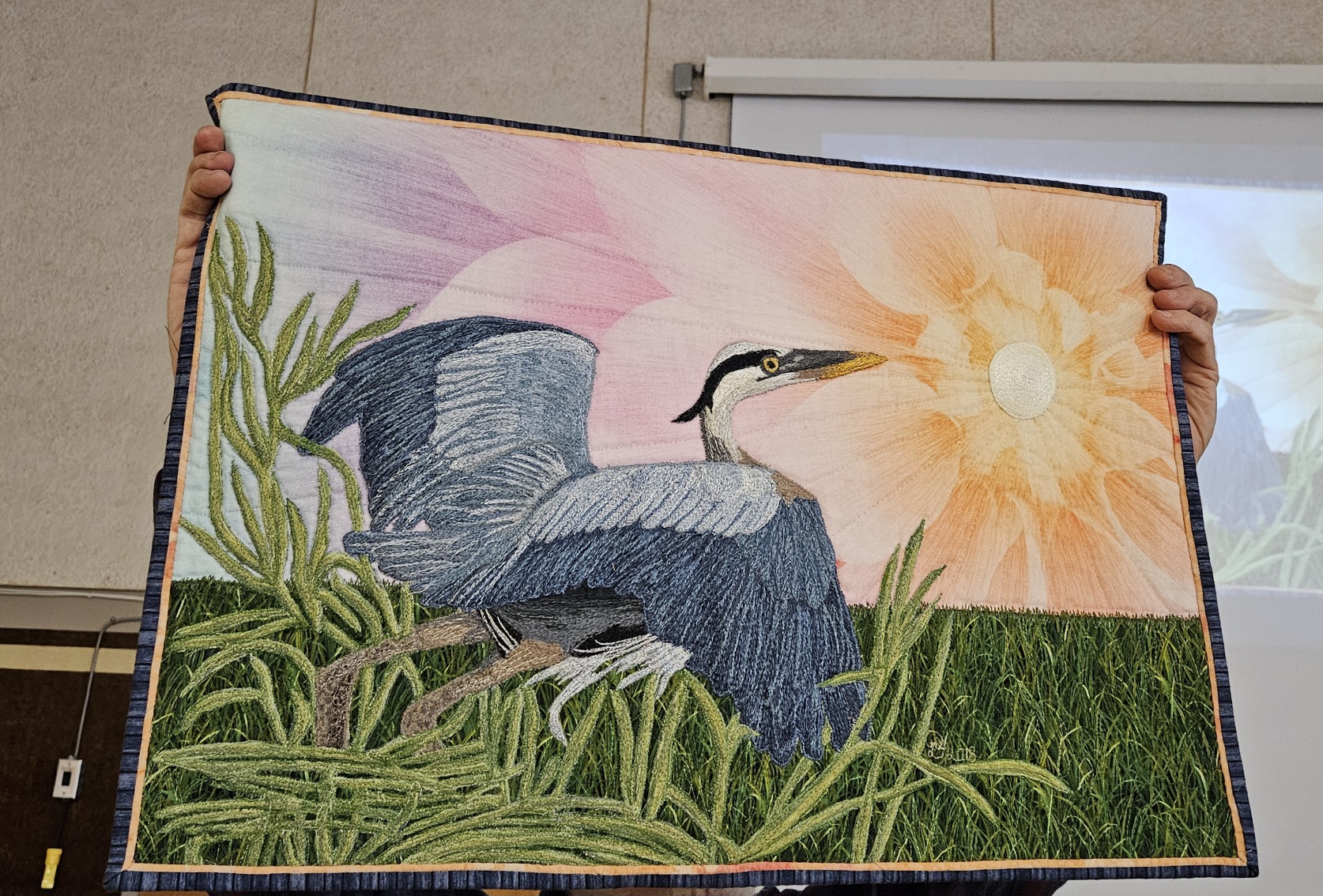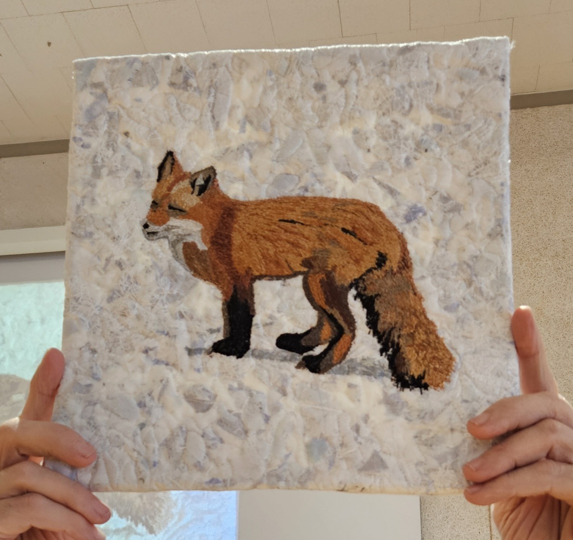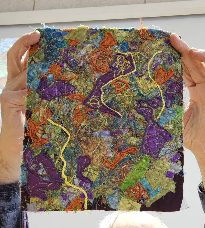 Thank you to our Guest Speaker Dale McMillan. Dale is a Fibre Artist (Quilt Artists of Muskoka) who generously took us on a journey of her artistic quilt making. From that first tiny sewing machine costing a whopping $150 in today’s dollars, to a pictorial record of nature, family and memory. Active in SAQA Dale let us peek behind her curtain of process and expression in an up close and tactile manner, hard to resist. Many thanks also to Dale’s husband Reg, for his white glove services.